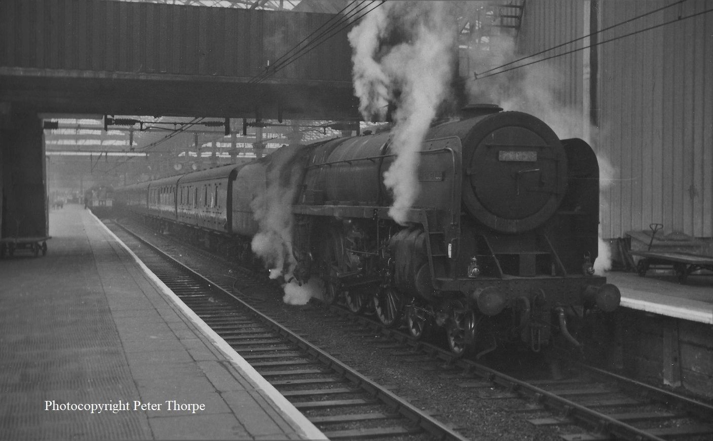 Britannia 70048 THE TERRITORIAL ARMY 1908-1958 on a North bound heavy parcel train, awaiting a clear road. This pause appeared to give the fireman a chance to build up his fire as the loco’s safety valves started blowing off just prior to moving off.