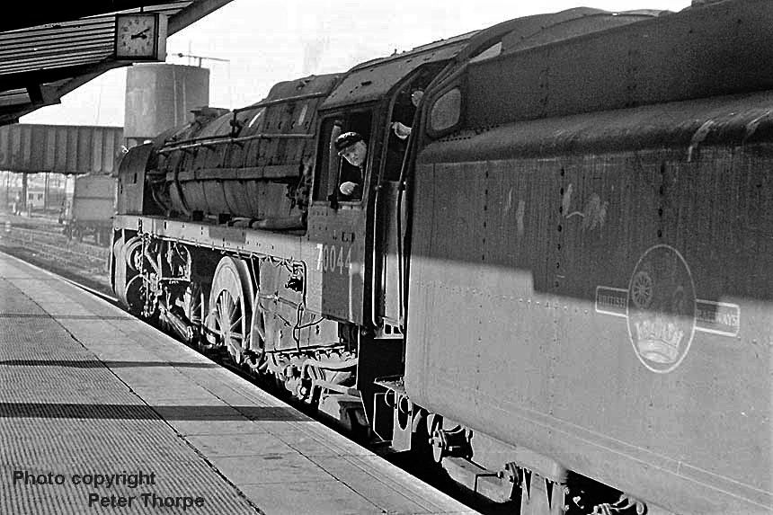 Britannia 70044 EARL HAIG having a change over of crews, with myself trying to over hear the conversation that usually involved a discussion regarding the condition of the loco and state of the fire etc.