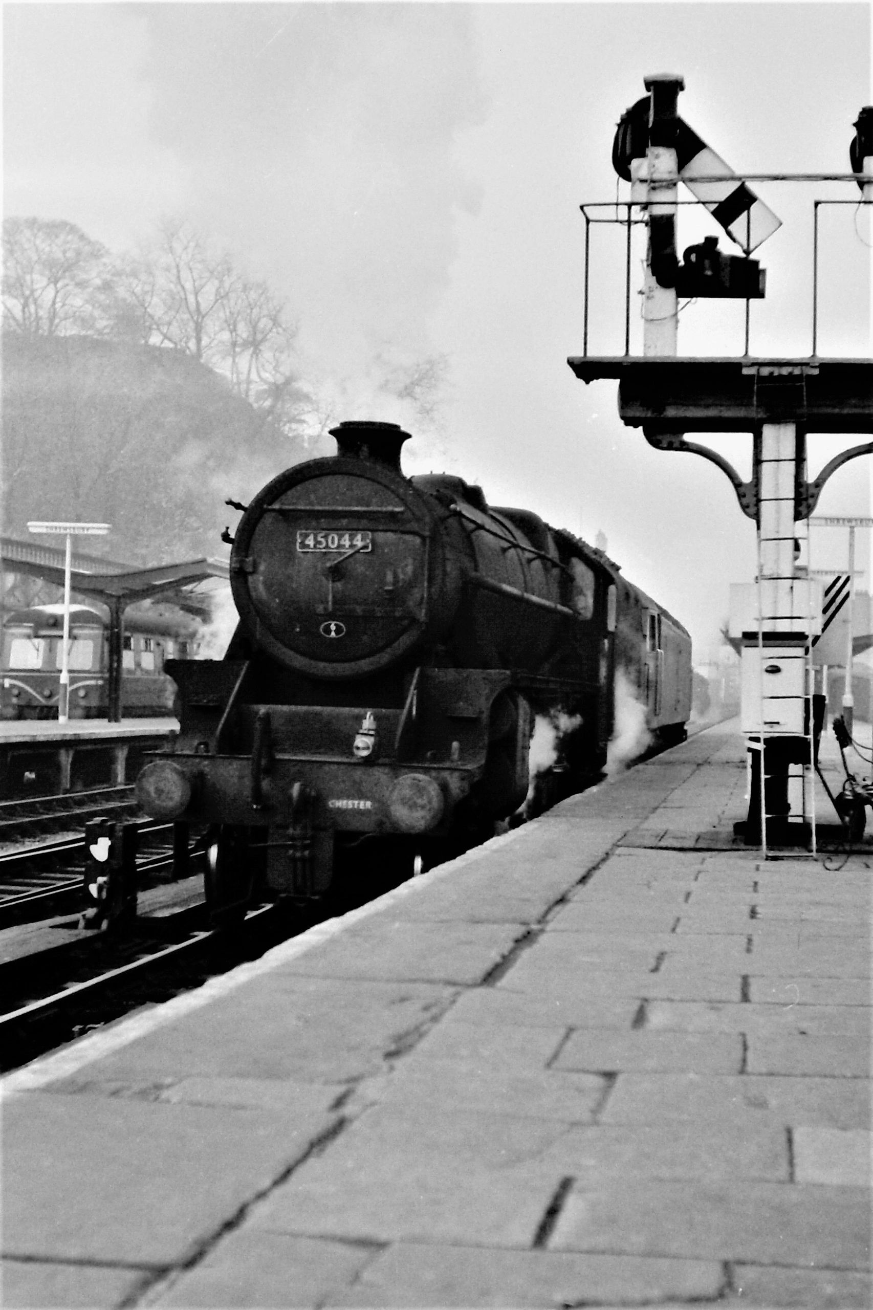 Seen running through Shrewsbury station on a dull winters day are a pair of coupled light engines, Black Five 45044 a 6A Chester allocation plus an unidentified Brush type 4 Diesel.