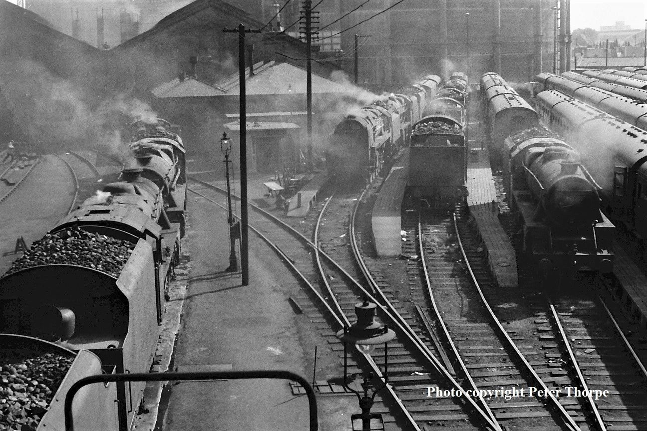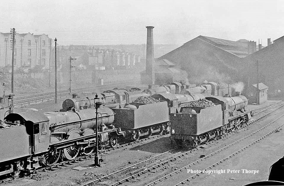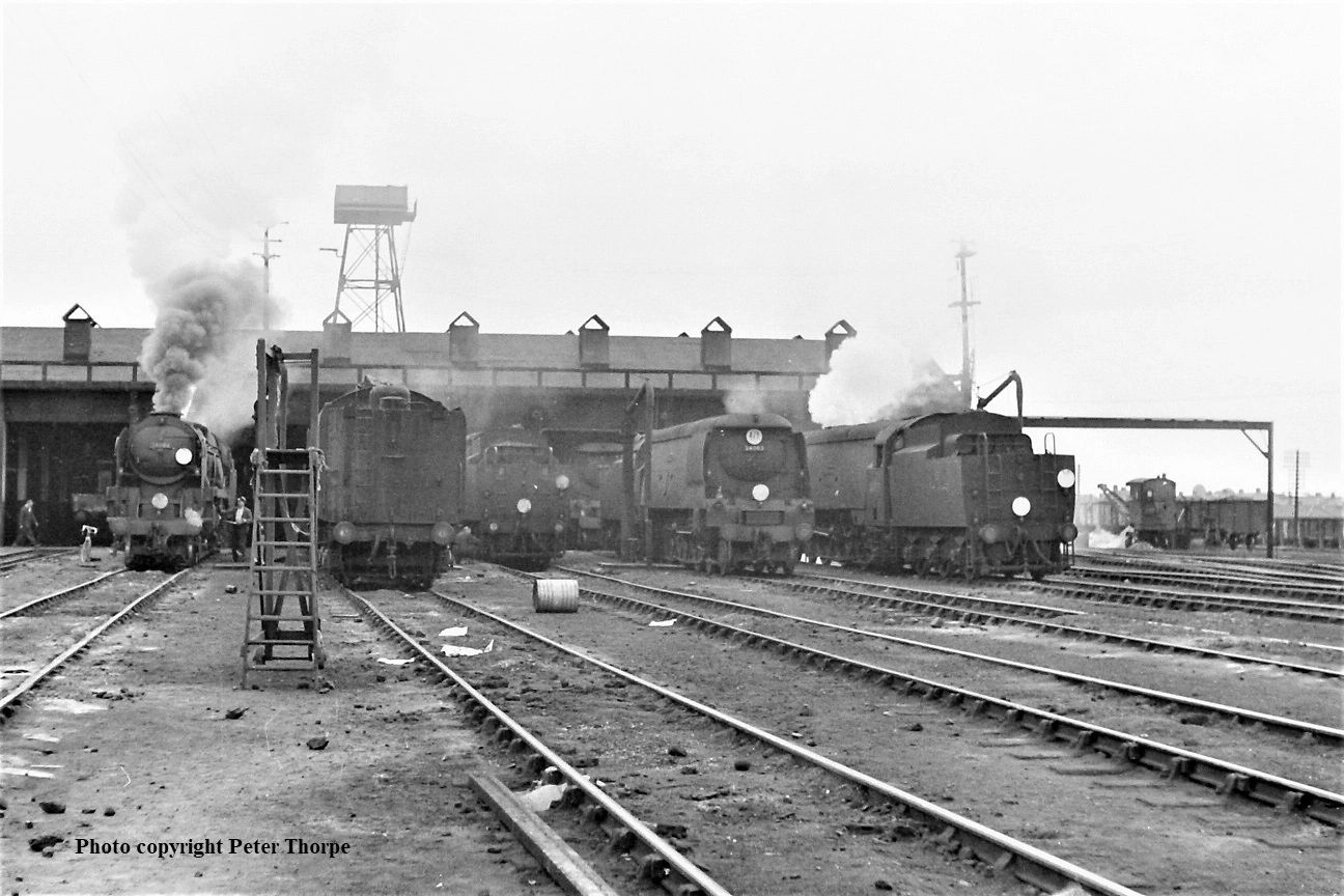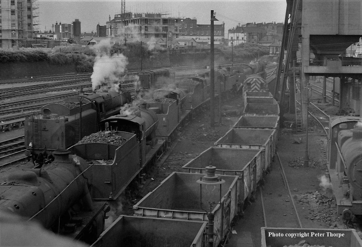 A varied collection of steam loco classes plus the inevitable diesel shunter by the coaling tower were noted in this shed scene.