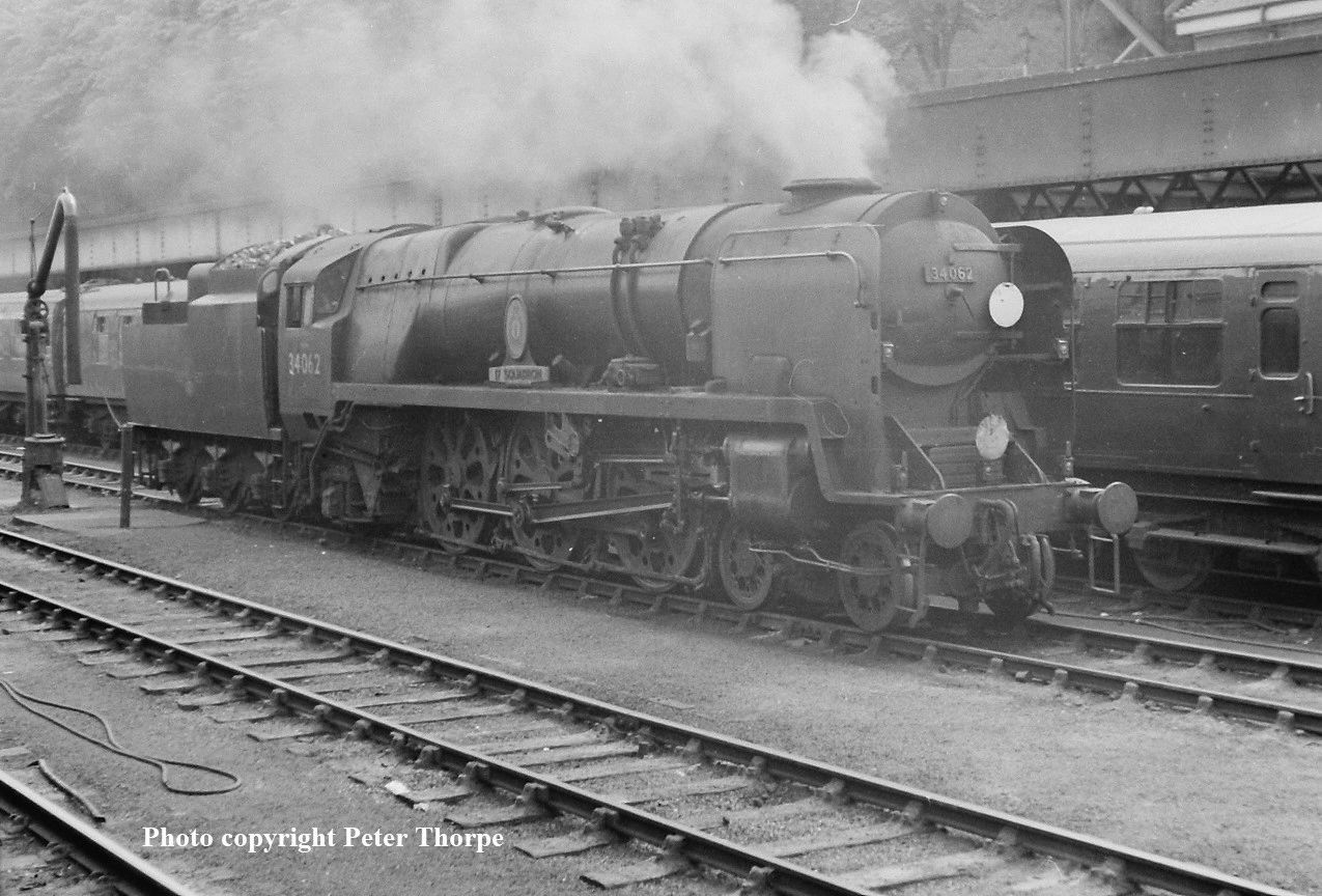 WC 34036 WESTWARD HO arriving at the Station with the fireman noting the single enthusiast sporting the then obligatory duffle bag.
