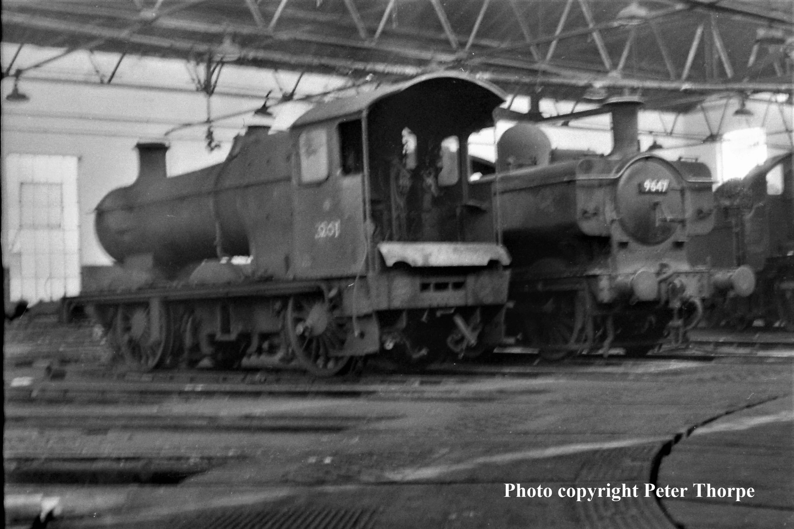 Inside the rather derelict looking roundhouse I managed to take a poor quality photograph of Collett 0-6-0 class 2251 number 3201 - a Templecombe (S&D) 83G allocated loco and Collett 57xx class 0-6-0PT 9647 at rest in its home shed.